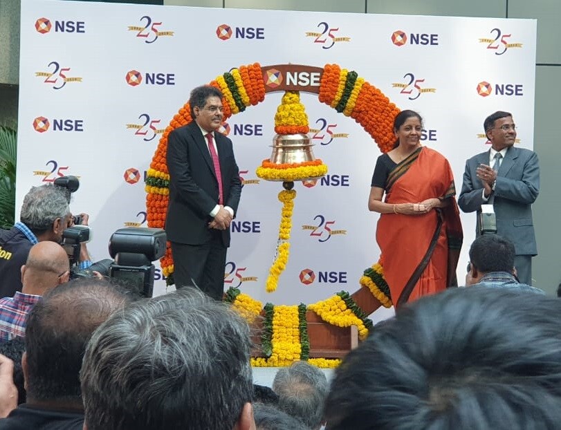 Finance Minister Nirmala Sitharaman with SEBI Chairman Ajay Tyagi, left, and NSE CEO Vikram Limaye at an event to mark 25 years of the National Stock Exchange. (Image: BloombergQuint)