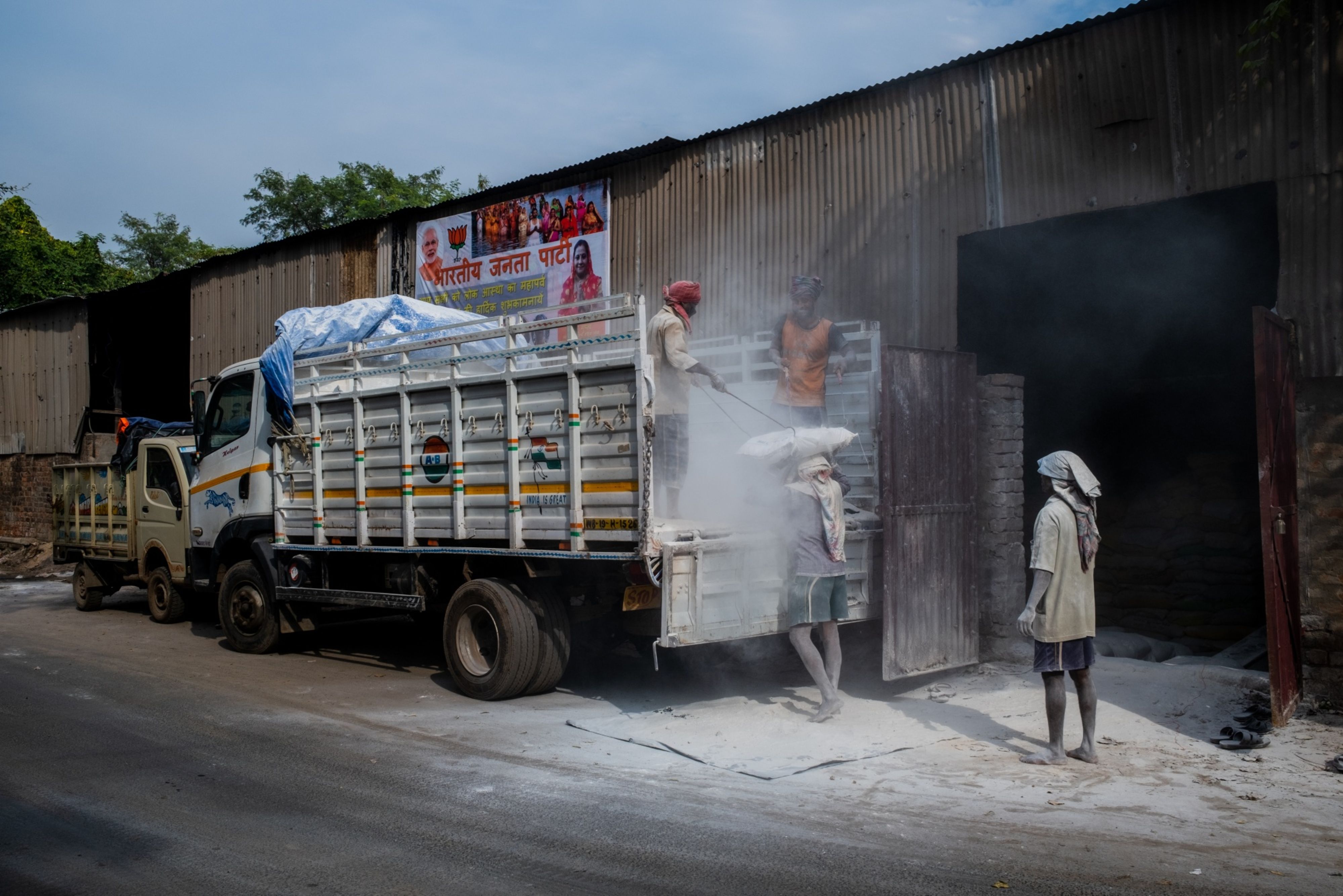 People load sacks of cement onto a truck outside a warehouse in Kolkata, India. (Photographer: Arko Datto/Bloomberg)