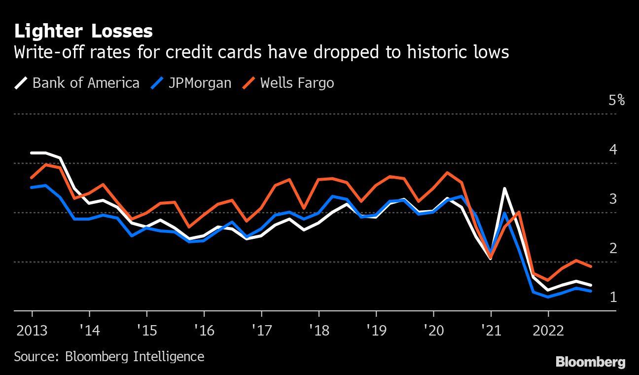 BofA's results mirrored those reported last week by rivals JPMorgan Chase & Co. and Wells Fargo & Co. All three banks saw net charge-off rates in their credit-card portfolios decline from the second quarter even as spending on the firms' cards soared.