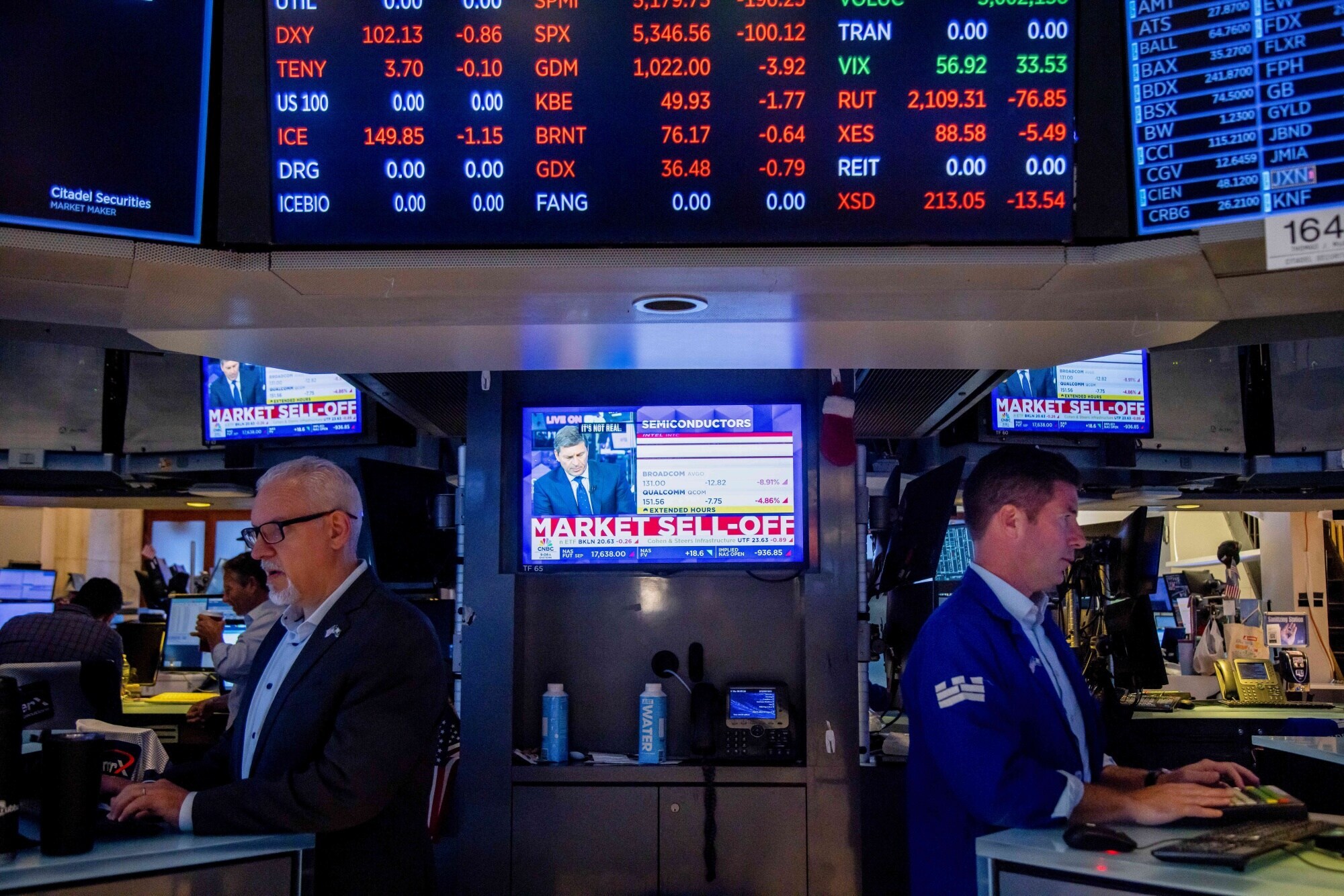 That test has now arrived. As stocks slid on Monday, the Cboe Volatility Index — Wall Street's famous “fear gauge” that tracks options on the S&P 500 Index — surged as much as 42 points in the biggest one-day spike in data going back to 1990. It was up 10 points at 12:14 p.m. in New York at the highest on a closing basis since 2021. The benchmark equity index itself dropped as much as 4.3%.