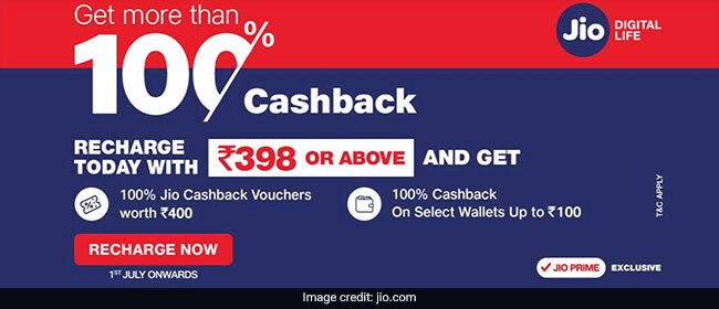 In order to avail this cashback offer from Reliance Jio, customers need to recharge with a prepaid recharge plan of Rs. 398 or above, according to jio.com. The cashback will come in the form of 100 per cent cashback vouchers worth Rs. 400. Another 100 per cent cashback up to Rs. 100 will also be offered on select payment wallets, Jio said.