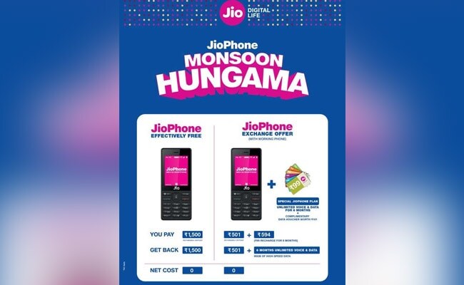 Reliance Jio has come up with 'Monsoon Hungama' exchange offer under which, JioPhone will be available for Rs 501. Customers can exchange any old feature phone (of any brand) for a brand new JioPhone (existing model) at an effective entry cost of Rs. 501, Reliance Jio said in a press release. The offer can be availed instantly at the retail point, on exchanging any old 2G/3G/4G (non-VOLTE) phone. Additionally, Rs 501 is also a 100 per cent refundable security deposit at the end of 3 years, further said the release.