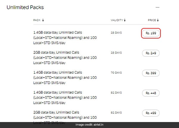 This prepaid pack of Airtel offers 1 GB data per day, which means a total of 28 GB data for a validity period of 28 days, said Airtel. This prepaid recharge plan of Airtel offers 100 SMS per day. Local, STD and roaming calls are free and unlimited. However, this plan is for select users only.