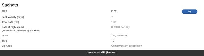 Reliance Jio prepaid recharge plan of Rs 52