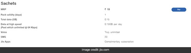 This prepaid recharge plan of Reliance Jio offers 0.15 GB or gigabytes high-speed data per day, after which internet speed gets reduced to 64 kbps. The total data offered in this pack is 0.15 GB. This plan which is valid for only a day, offers a total of 20 short message service (SMS), said Jio. Voice calls are unlimited.