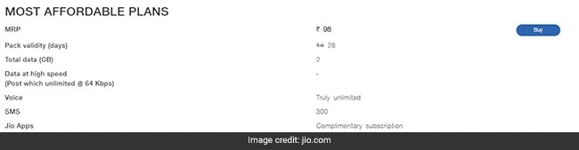 Reliance Jio prepaid recharge plan of Rs 98
