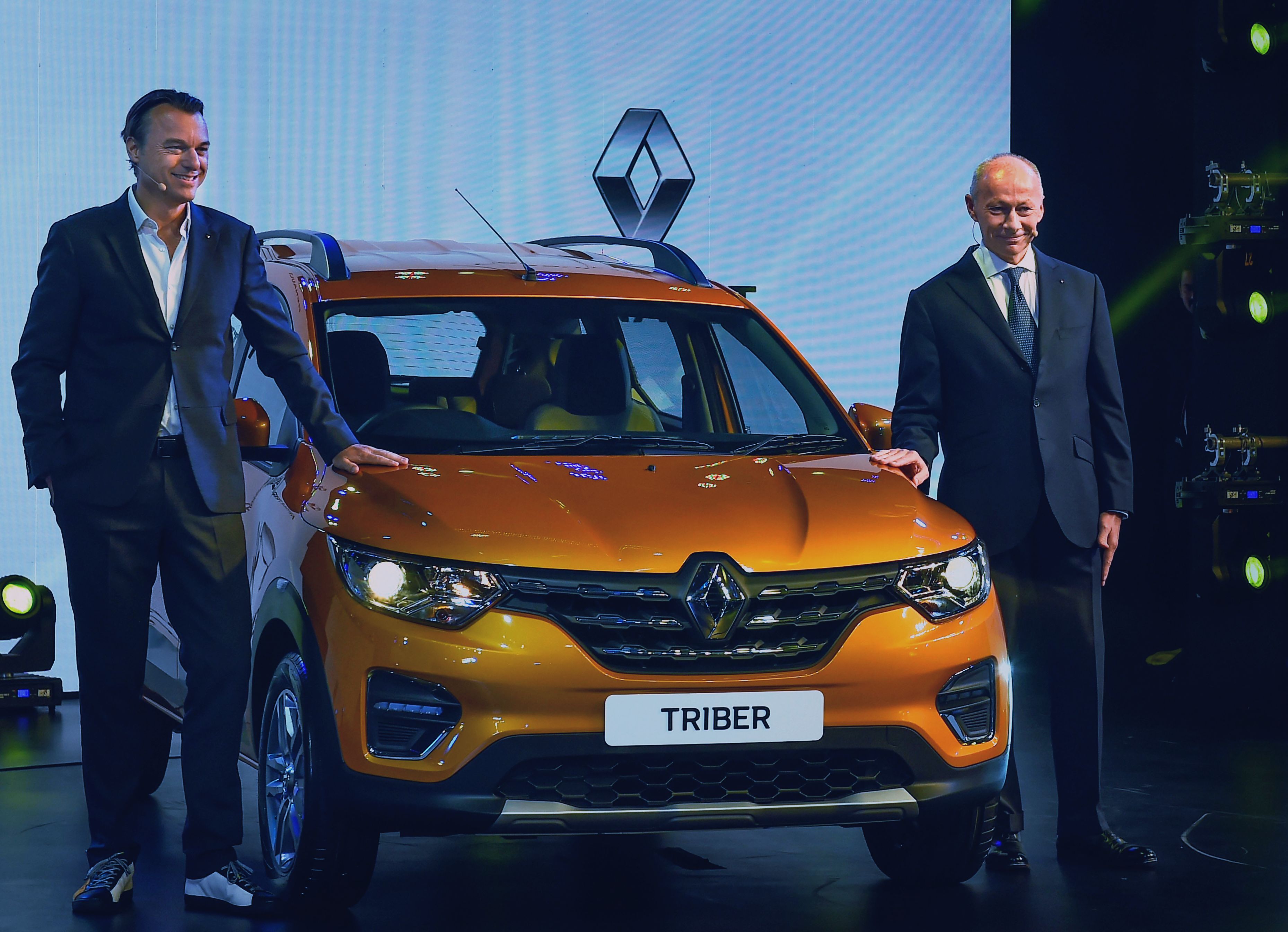 Renault Group CEO Thierry Bollore (right) and Africa-Middle East-India Region head Fabrice Cambolive at the launch of the Renault Triber in Delhi on Wednesday. (Photo: PTI)