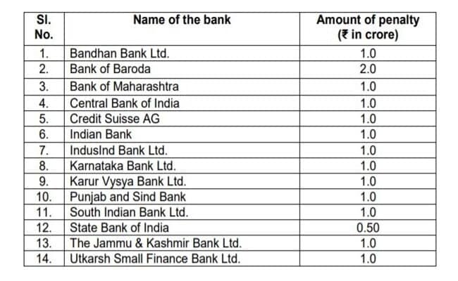 A penalty of Rs 1 crore penalty has been imposed each on Bank of Maharashtra, Bandhan Bank, Credit Suisse AG, Central Bank of India, IndusInd Bank, Indian Bank, Karur Vysya Bank, Karnataka Bank, Punjab and Sind Bank, The Jammu & Kashmir Bank, South Indian Bank, and the Utkarsh Small Finance Bank.