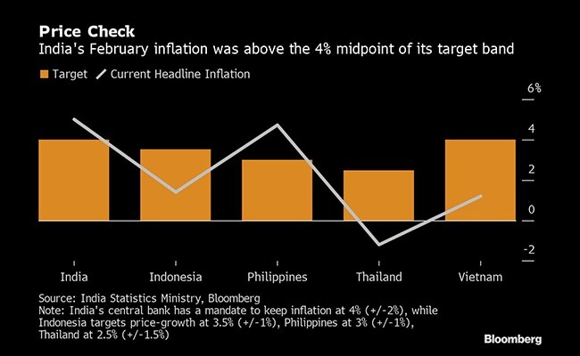 India is among the few emerging markets in Asia where inflation is above the midpoint of its target band, due largely to food prices that are rising after a brief drop. Economists in a recent Bloomberg survey saw CPI at 5 per cent in the April-June period before easing to 4.7 per cent in the next three months. That compares with the central bank's forecast of 5 per cent-5.2 per cent for the April to September period.