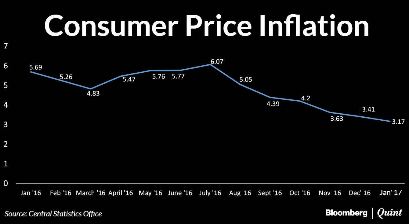 Consumer price inflation declined to 3.17 percent last month compared to 3.41 percent in December 2016 and 3.63 percent in November 2016, data from the Central Statistics Office showed. At current levels, retail inflation remains well below the Reserve Bank of India's (RBI) target of 5 percent for March 2017. A Bloomberg poll of 32 economists estimated the inflation to fall to 3.24 percent in January.