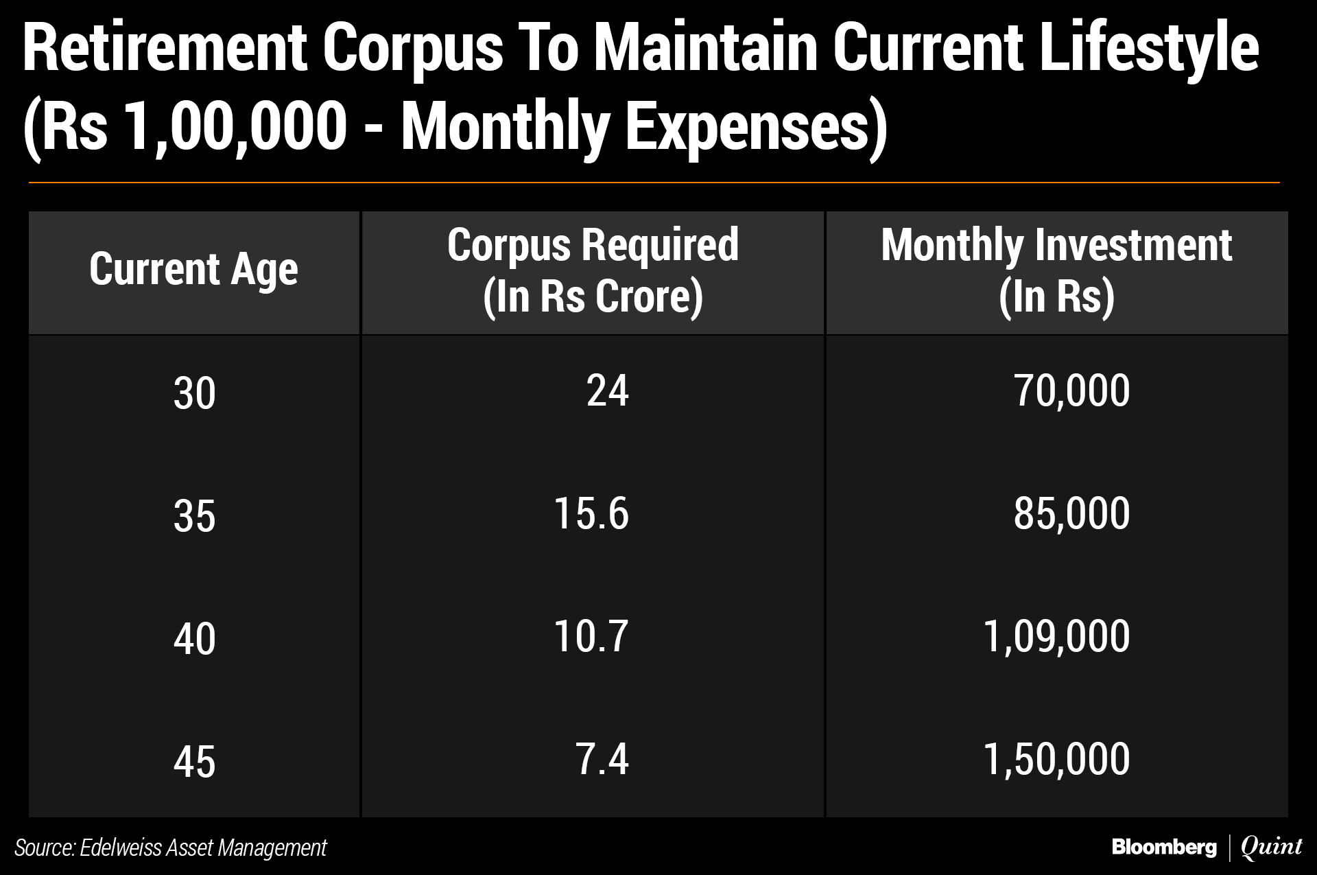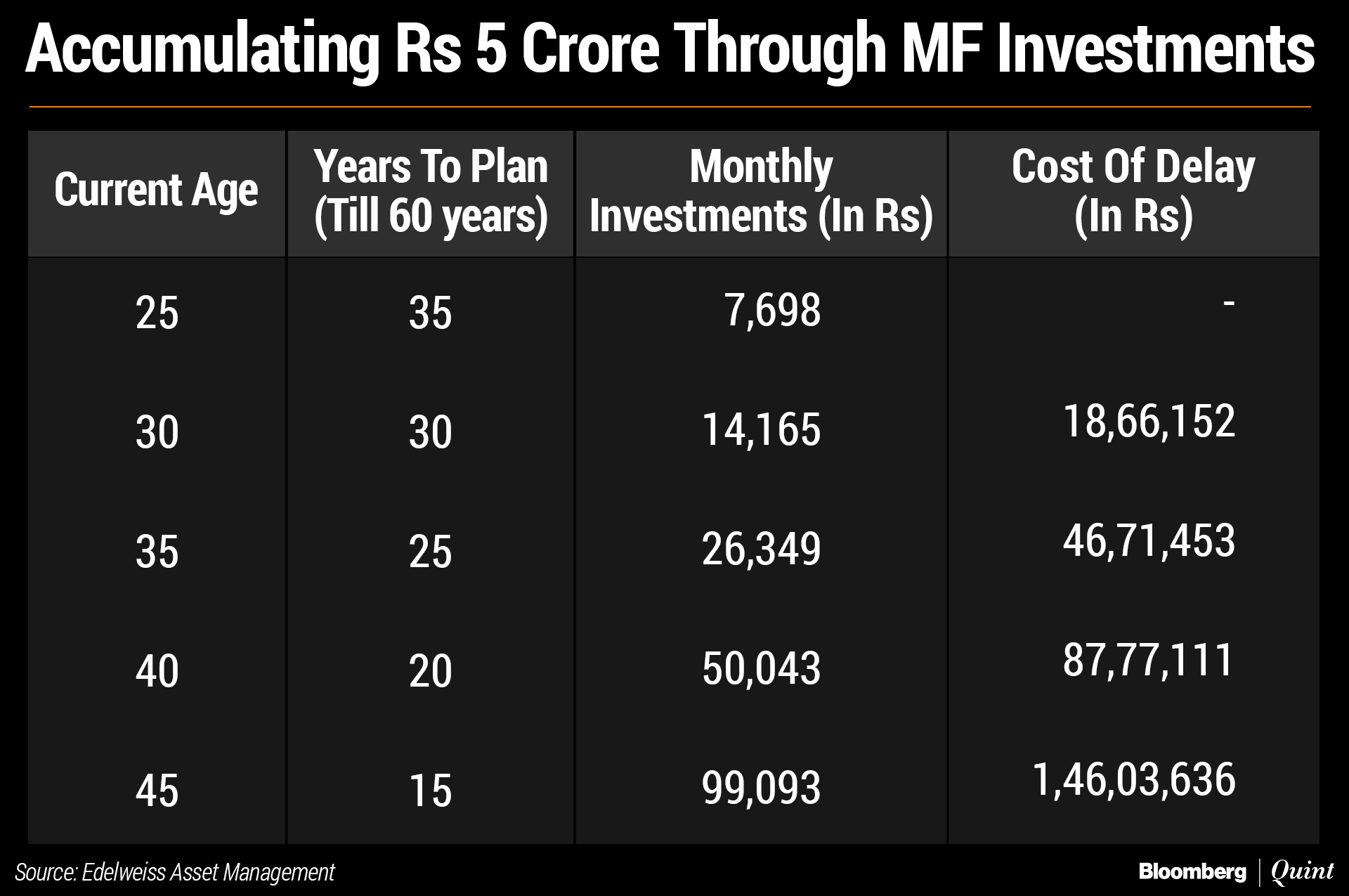 A 25-year-old who is planning to retire at age of 60 years needs about Rs 5 crore to fund his retirement, assuming a rate of 12 percent return on his investment. This means a monthly investment of Rs 7,697 today. In comparison, if you start investing at the age of 45 years, the same parameters mean a monthly investment of Rs 99,093!