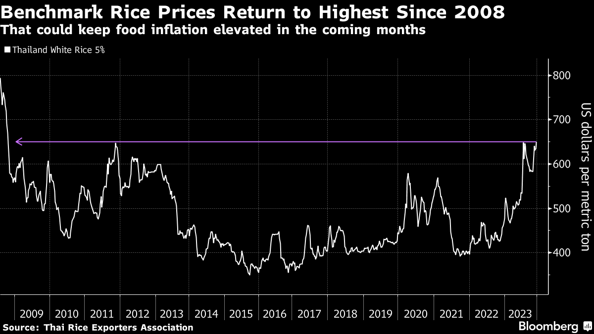(Bloomberg) -- Rice prices reached a fresh 15-year high on mounting concerns that increased demand and the impact of El Niño will further tighten supplies of the grain that is a staple for billions across Asia and Africa.
