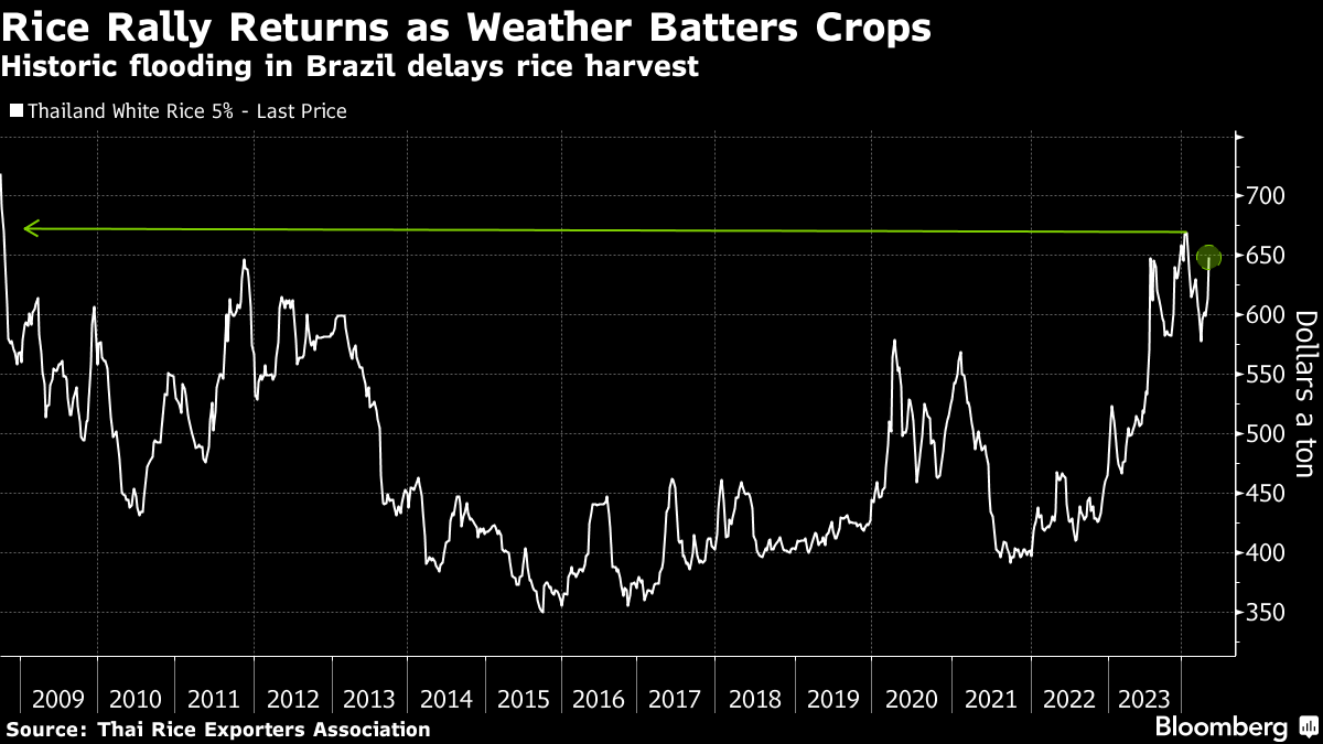 Supplies were already upended by sweeping export restrictions from top shipper India last year and worries that drier weather from El Niño would curb output in the important growing region of Southeast Asia. Now catastrophic floods in southern Brazil are adding to the jitters.
