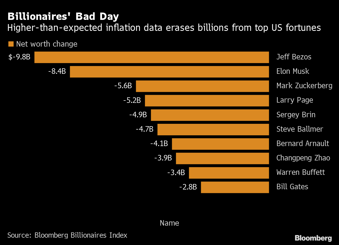 Jeff Bezos's wealth plunged by $9.8 billion, the most among those tracked by the Bloomberg Billionaires Index. Elon Musk's net worth dropped by $8.4 billion. The fortunes of Mark Zuckerberg, Larry Page, Sergey Brin and Steve Ballmer all declined by more than $4 billion, while Warren Buffett and Bill Gates lost $3.4 billion and $2.8 billion, respectively.