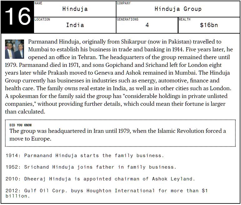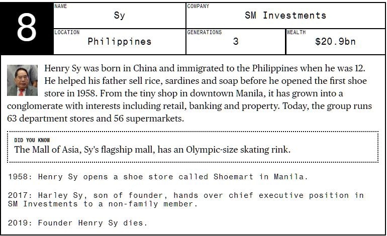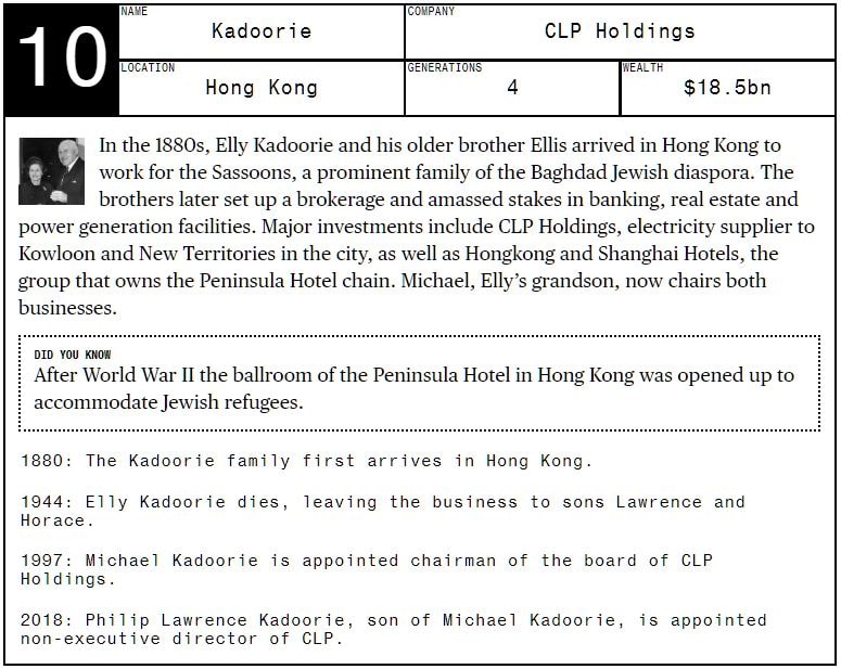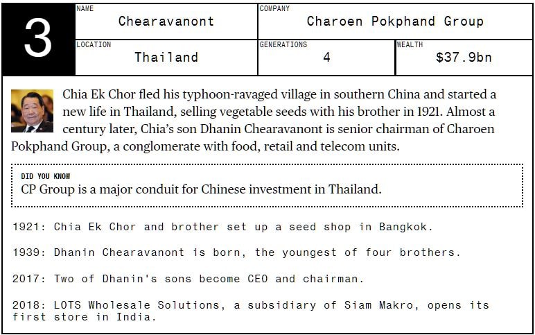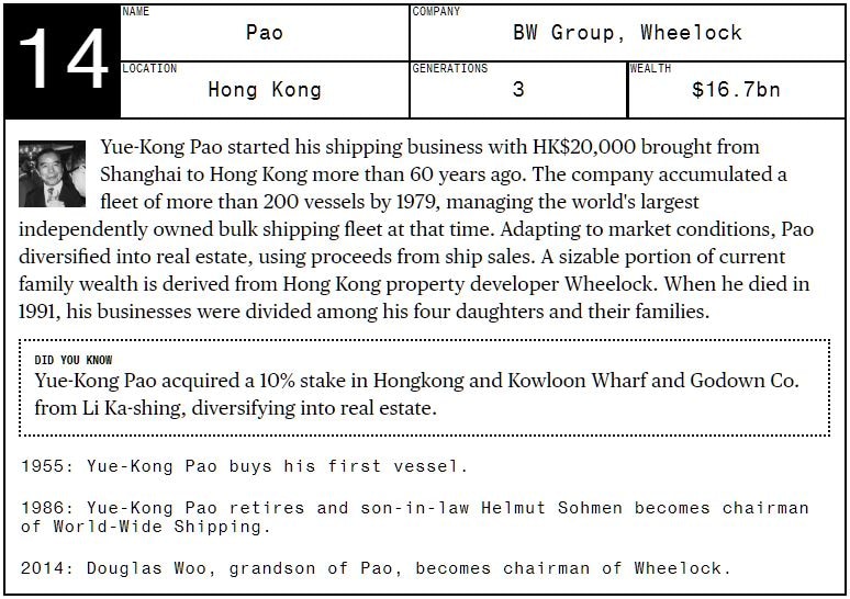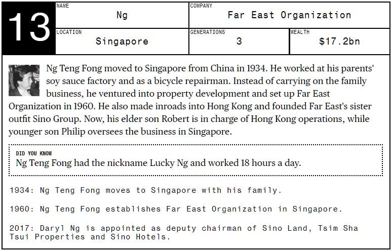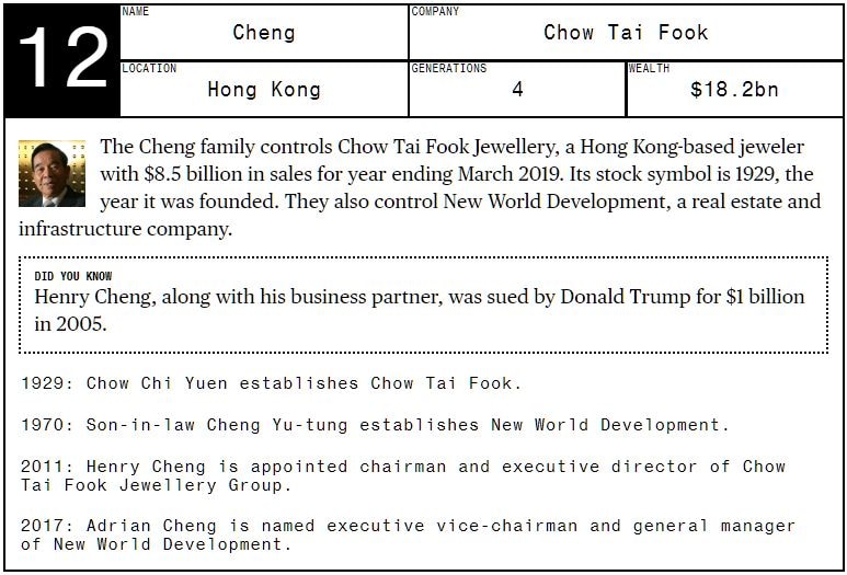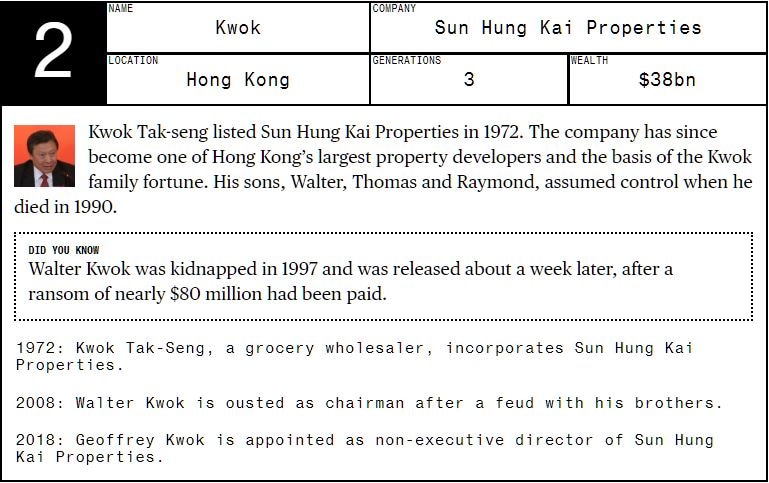 Other trends stand out. Real estate is one; most families on the list derive the bulk of their fortunes from property development or have holdings worth billions.