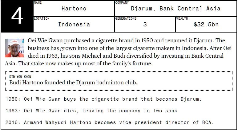 Bloomberg's categorization of family wealth excludes first-generation fortunes such as that of Alibaba Group Holding Ltd.'s Jack Ma, as well as those in the hands of a single heir. That means no families from mainland China make the list, reflecting the country's relatively recent surge in affluence. President Xi Jinping's campaign against extravagance has brought down some of the super-rich who were rising a few years ago. Still, many of Asia's wealthiest clans have Chinese roots, from the Chearavanonts of Thailand to the Hartonos of Indonesia.