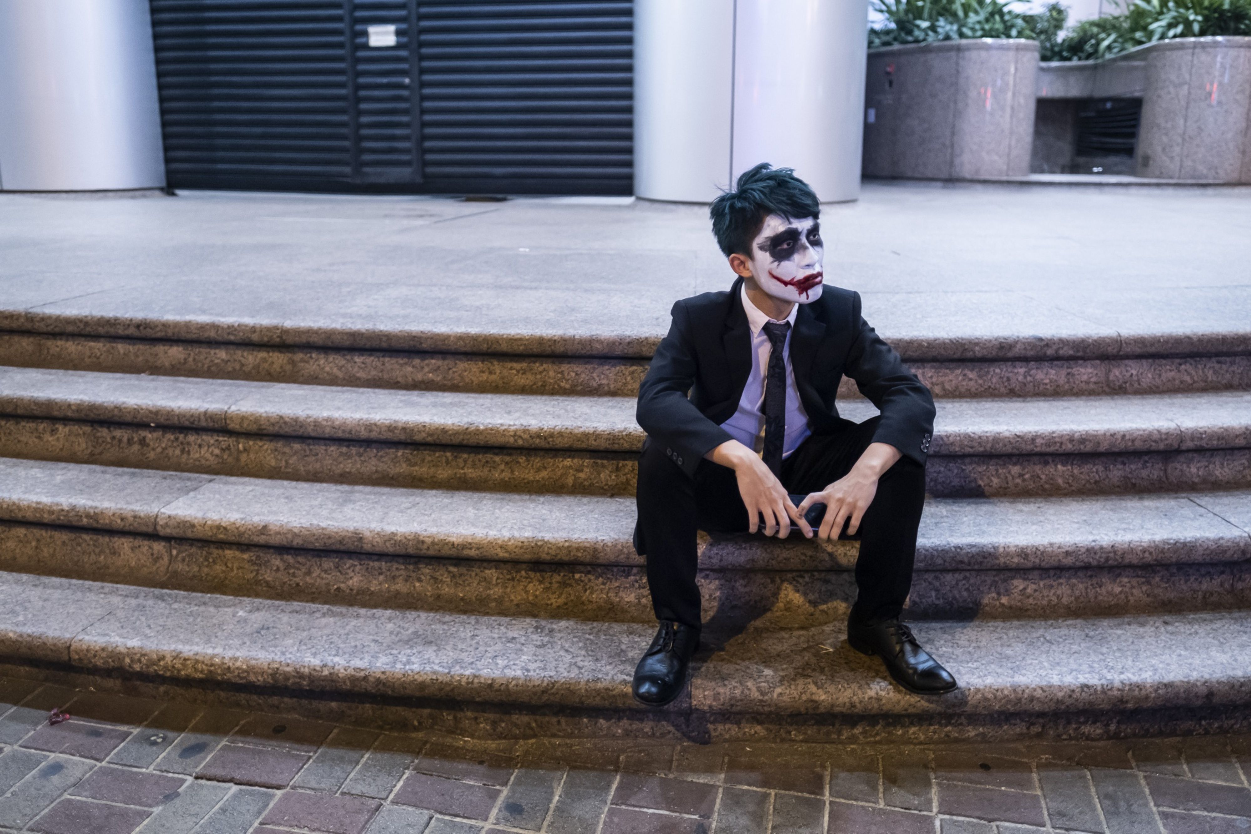 A ‘Halloween’ protester wears face paint depicting The Joker in the Sheung Wan district of Hong Kong, China, on Thursday, Oct. 31, 2019. Photographer: Justin Chin/Bloomberg