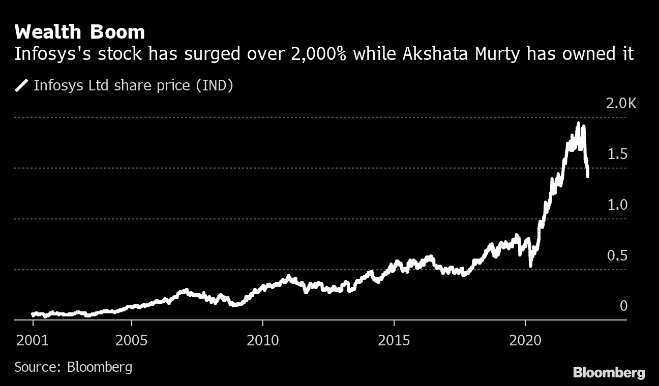 Murty, 42, who was born in India and is still an Indian citizen, has a net worth of about $1.3 billion thanks to her stake in Infosys Ltd., the software giant founded by her father, according to the Bloomberg Billionaires Index. The Bangalore-based company's shares have surged more than 2,000% since Murty was first publicly disclosed as a shareholder in 2001, though they have struggled this year in the face of a broad tech selloff.