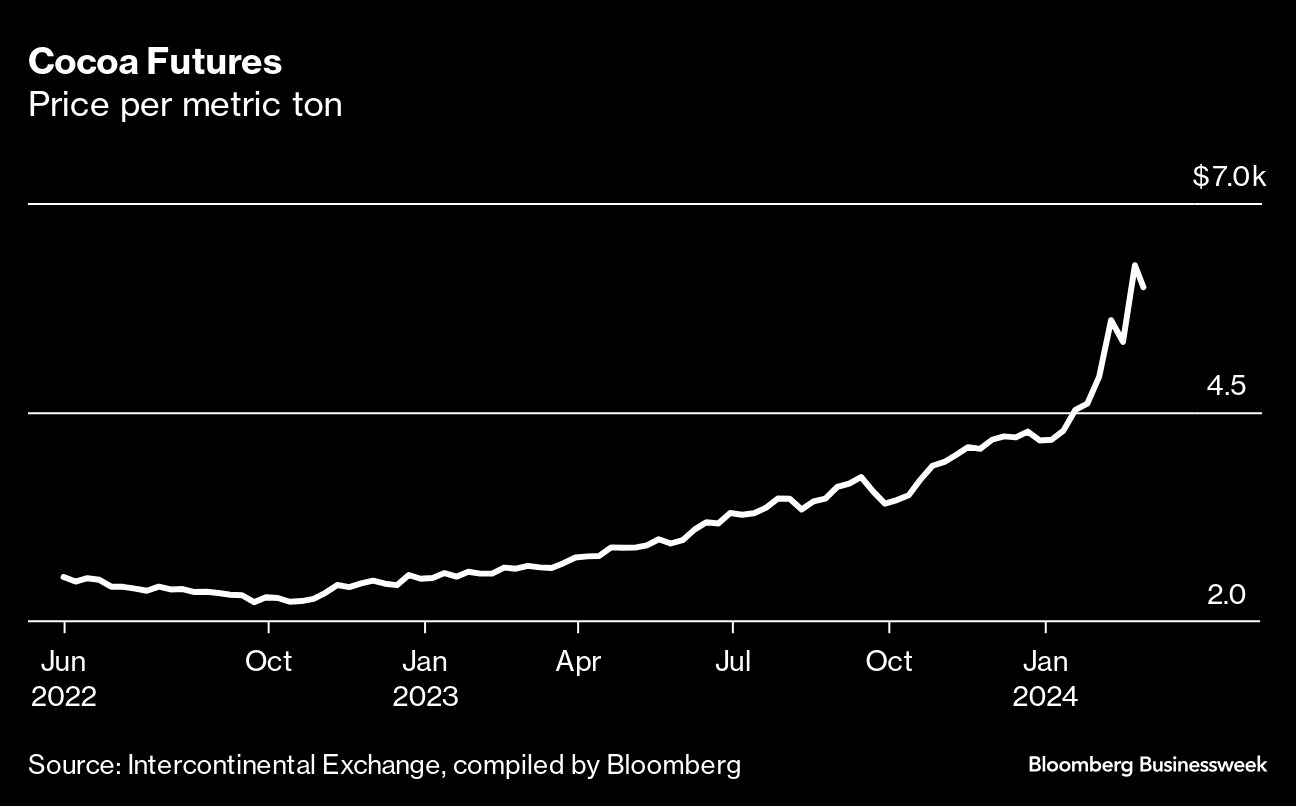 Cocoa prices have climbed to record highs, and market participants don't expect any near-term relief. Prices have skyrocketed as the world's biggest producers in West Africa grapple with drought and disease as well as structural problems that could linger for years to come. Futures traded in New York averaged well below $3,500 a metric ton every year from the 1980s until 2023. On Feb. 22 cocoa futures surpassed $6,000 a ton for the first time, and the market worries they could still have further to run.