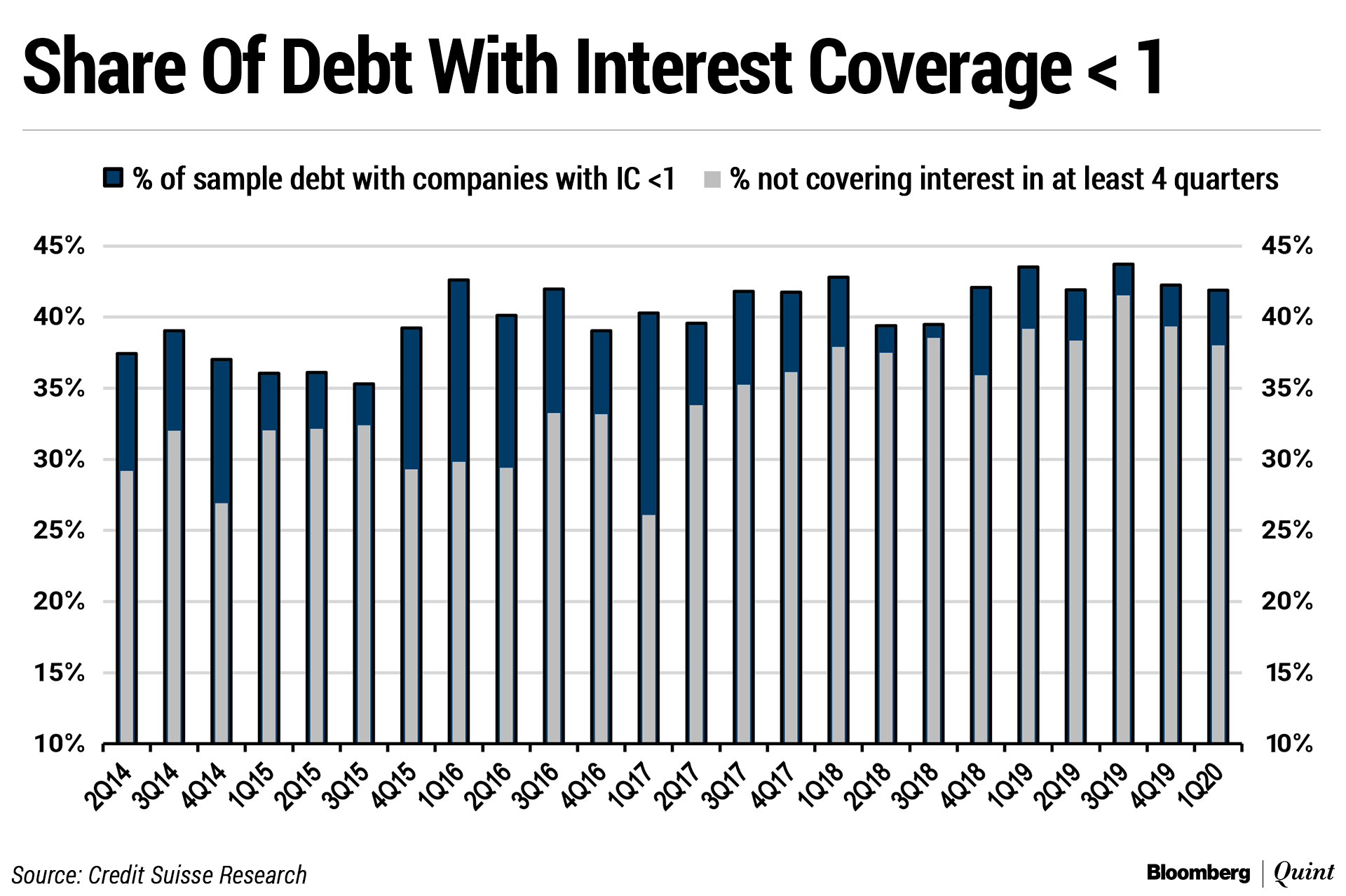 The share of debt with companies having interest coverage ratio of less than one for the past 12 consecutive quarters has increased to 56 percent (Rs 8.3 lakh crore of debt) vs 35 percent a year ago, Credit Suisse said.