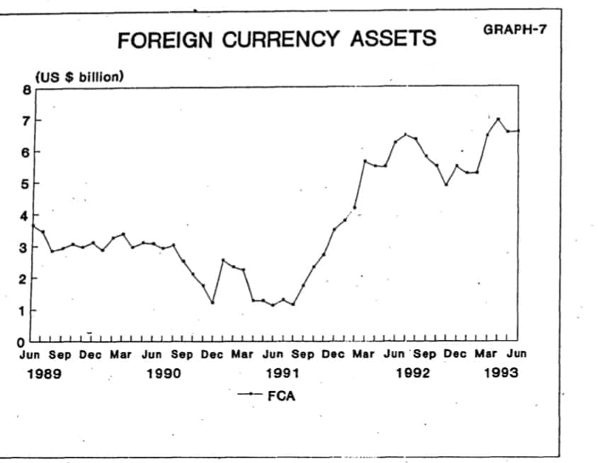 The was also a year in which India saw a sharp jump in forex reserves from about $9 billion in March 1993 to $19 billion a year from then. Both the current account and the capital account were improving. Exports rose to $22 billion that year.