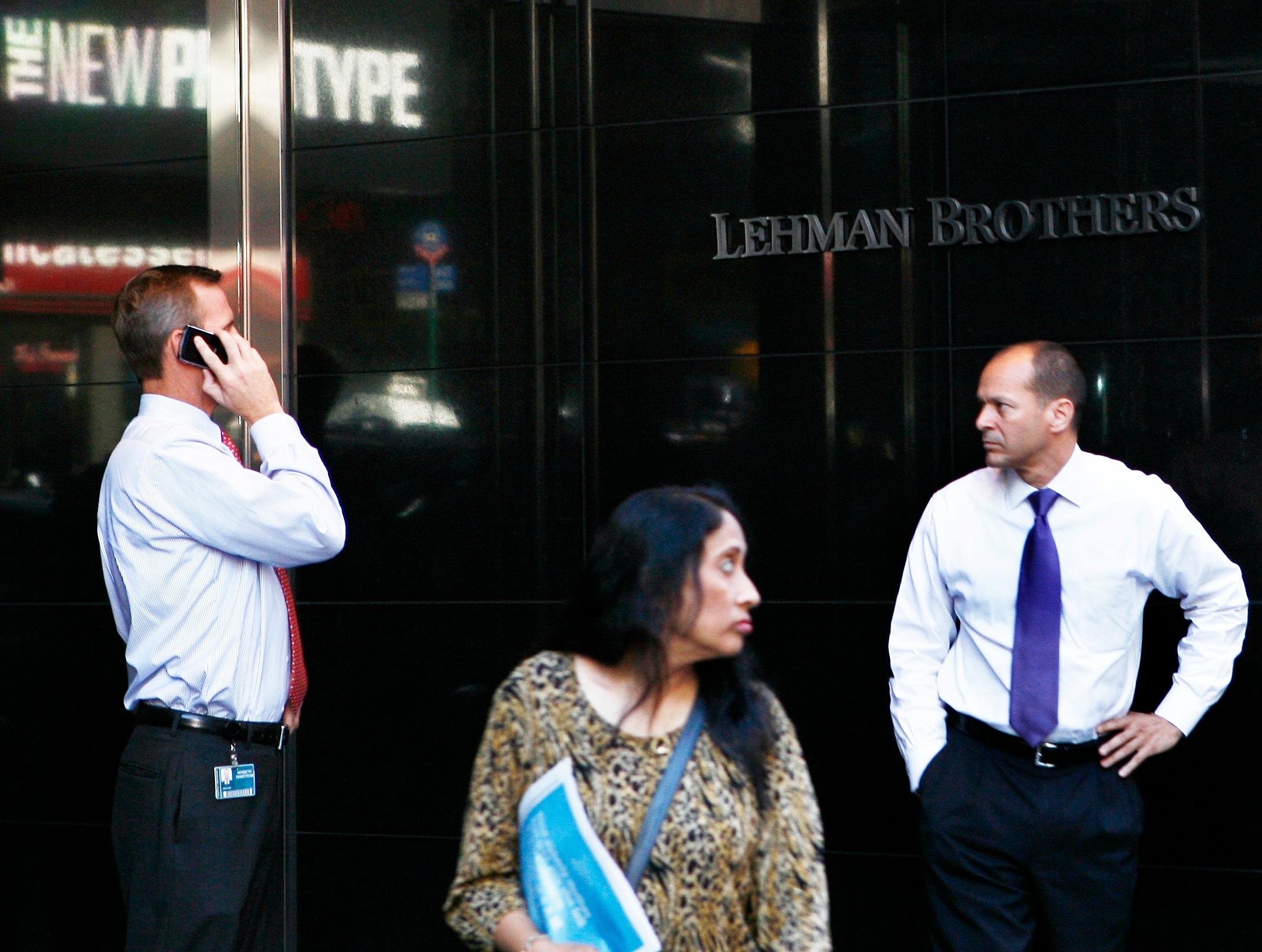 People stand outside the world headquarters for Lehman Brothers in New York September 15, 2008.