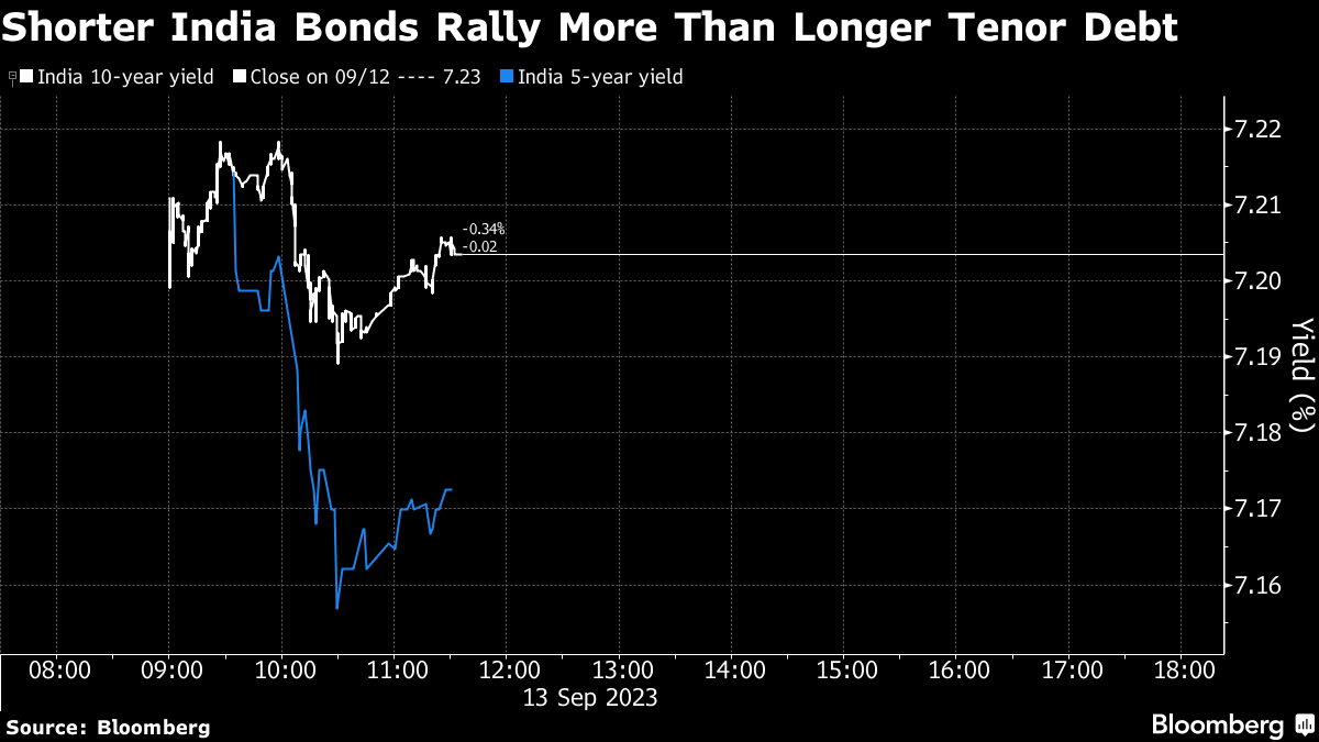 Yield on five-year bonds fell as much as 8 basis points to 7.16%, the most since May before paring slightly, while benchmark 10-year yields dropped 3 basis points to 7.2%. The spread between 10- and 5-year yields has been below 5 basis points this quarter and even turned negative late last week as investors priced in a long pause by the central bank.