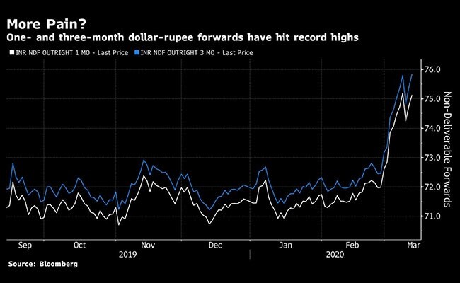 One-month dollar-rupee forwards are climbing for a fifth straight week and have reached an all-time high of 75.63. The rupee closed at 74.2175 per dollar, near a record low of 74.4825 set in 2018.