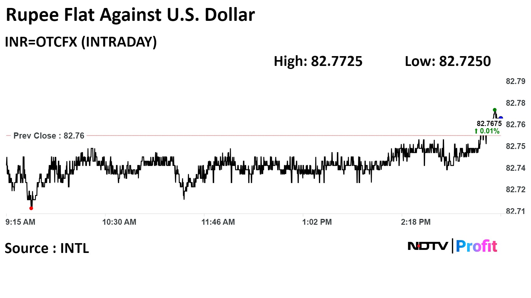 The local currency closed flat at 82.77 against the U.S. Dollar, after opening at Rs 82.72. It closed at 82.76 on Monday, according to Cogencis data.