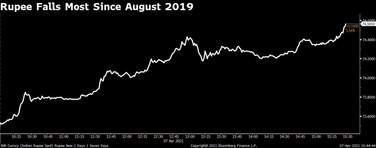The rupee fell 1.5% to 74.55 against the U.S. dollar, the steepest one-day drop seen since August 2019, according to data available from BloombergQuint.