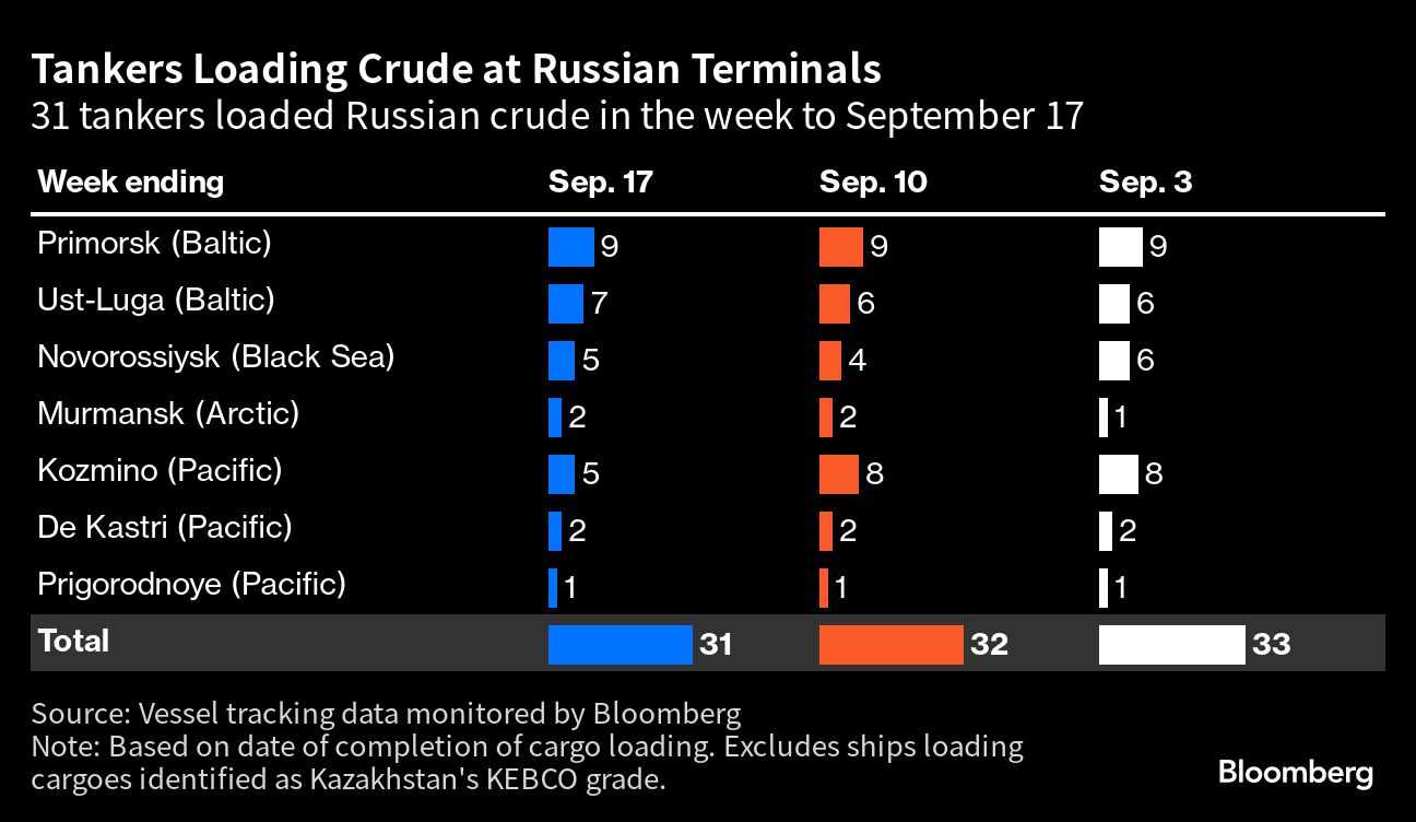 A total of 31 tankers loaded 23 million barrels of Russian crude in the week to Sept. 17, vessel-tracking data and port agent reports show. That's down slightly from the previous week's figure.
