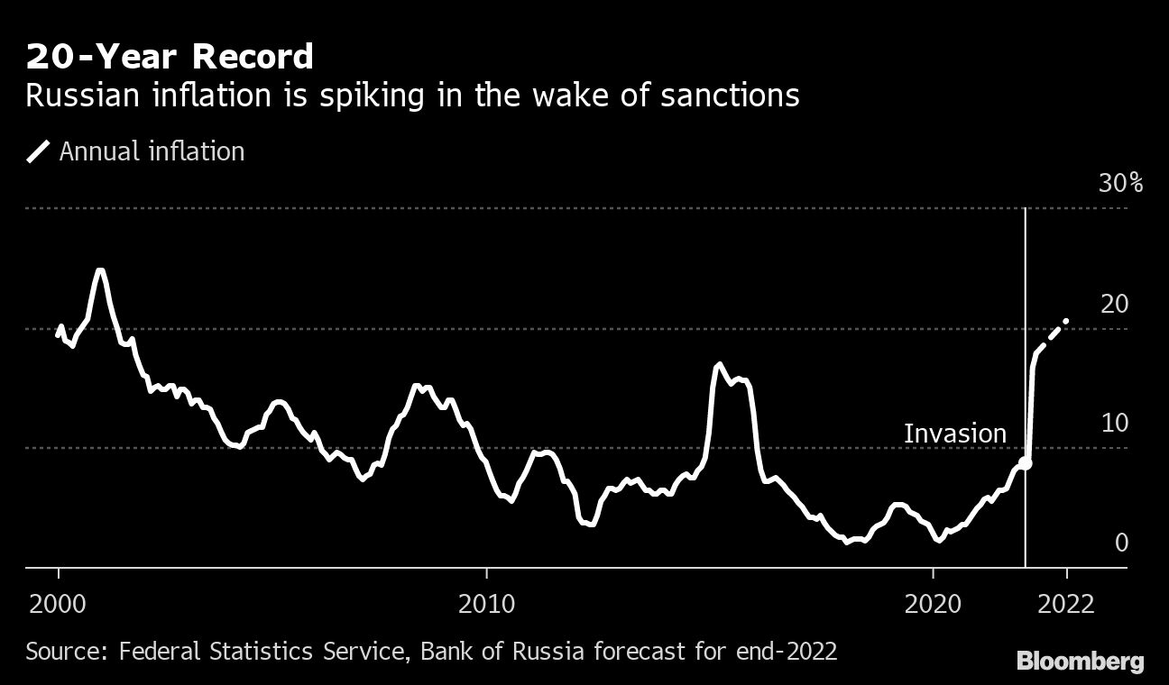 (Bloomberg) -- Russian inflation jumped to the highest level since 2002 as international sanctions imposed over Vladimir Putin's invasion of Ukraine pressured prices and disrupted supply chains.