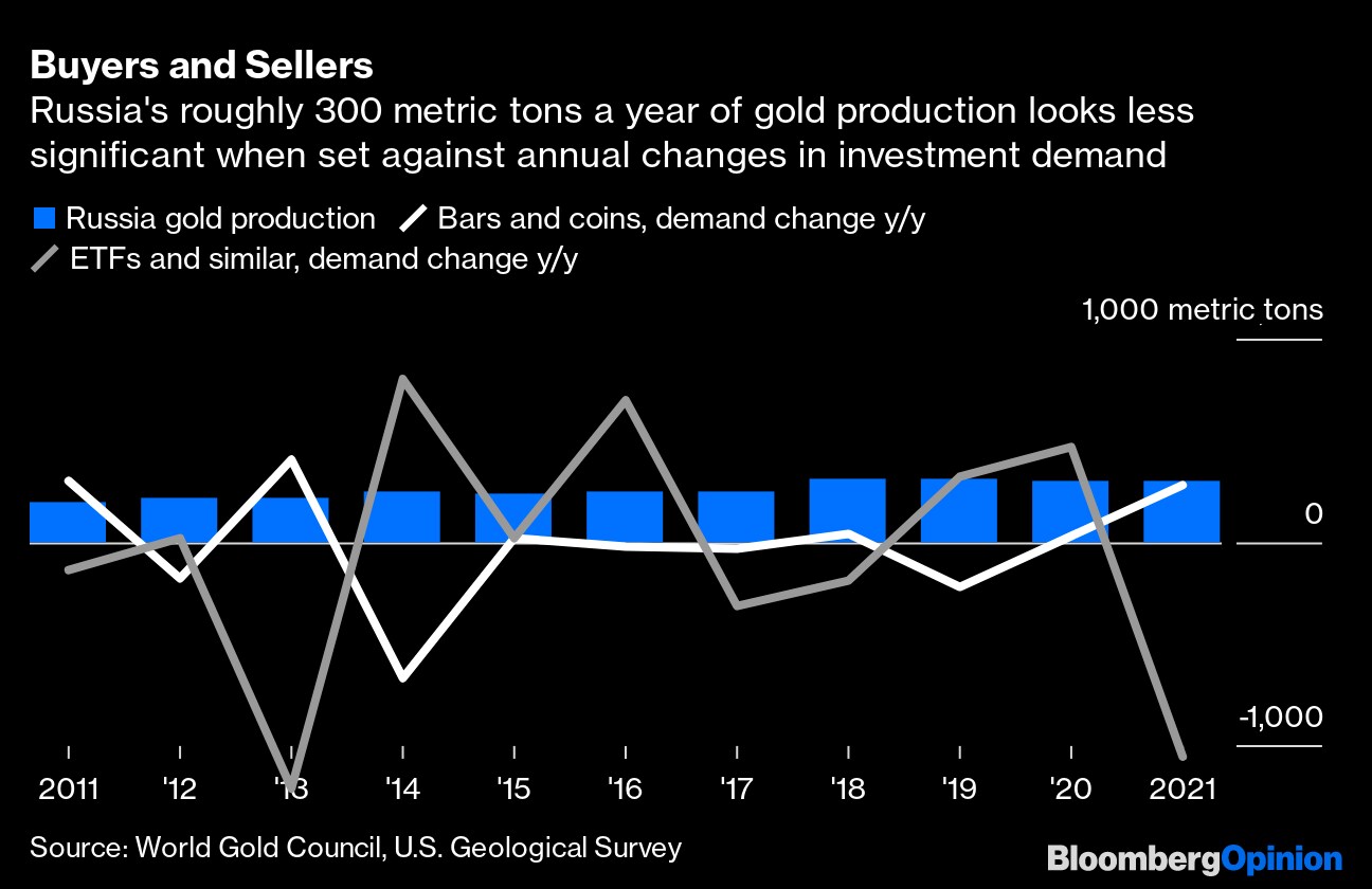 In a typical year, exchange-traded funds change their positioning in the gold market by 500 tons or so, driving the price up and down as investors' appetites swing from optimism to pessimism. That's going to be far more influential than whether the 300 tons produced by Russian mines end up in a G-7 vault, especially when you consider that the biggest net importers — China, India, and the United Arab Emirates — aren't even signing up to the sanctions.