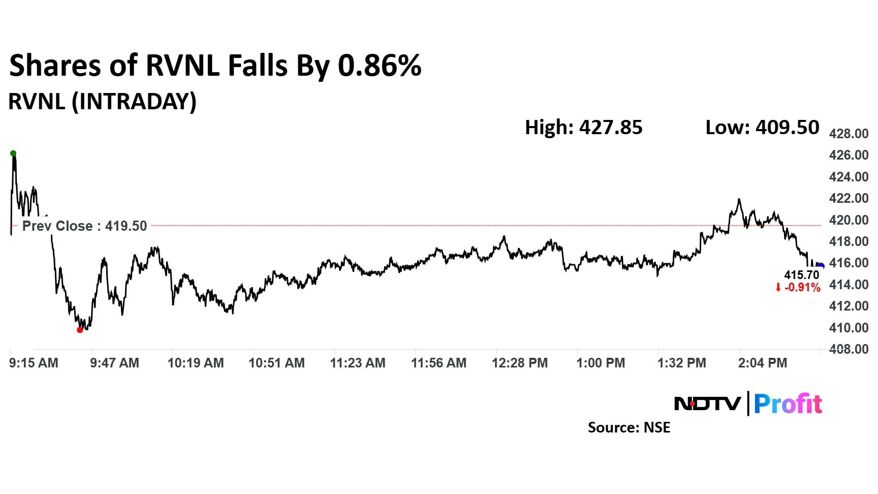 On Monday, the shares of RVNL fell as much as 2.38% to Rs 409.5 apiece. However, as the session progressed, it recovered some of the losses. At 3:00 p.m., the scrip was trading 0.6% lower at Rs 416.85 apiece on the NSE, compared to a 0.3% decline in the benchmark Nifty 50.