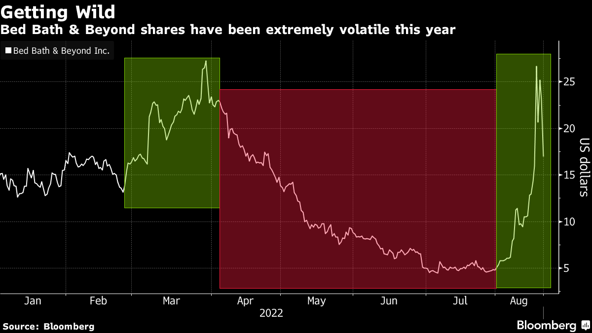 Bed Bath & Beyond shares have been on a tumultuous ride this year with its stock soaring by the most on record when, in March, RC Ventures first disclosed a 9.8% stake in the retailer and asked it to consider a sale of the company.