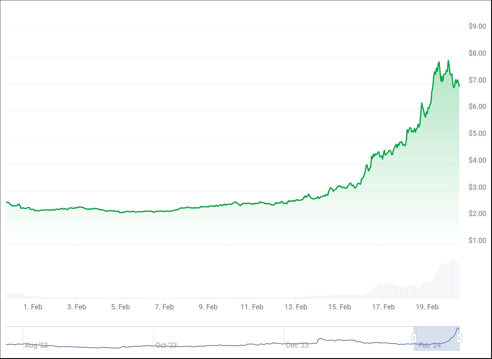 Worldcoin, the coin of the crypto project co-founded by OpenAI Chief Executive Officer Sam Altman, has jumped about 140% over the last seven days, according to CoinGecko data, rallying primarily after OpenAI announced the release of text-to-video application Sora. The advance has been losing some steam in the last 24 hours, with the token down 11% and trading at $6.81 apiece as of 1:20 p.m. London time on Tuesday. It reached an all-time high of $7.95 on Monday.
