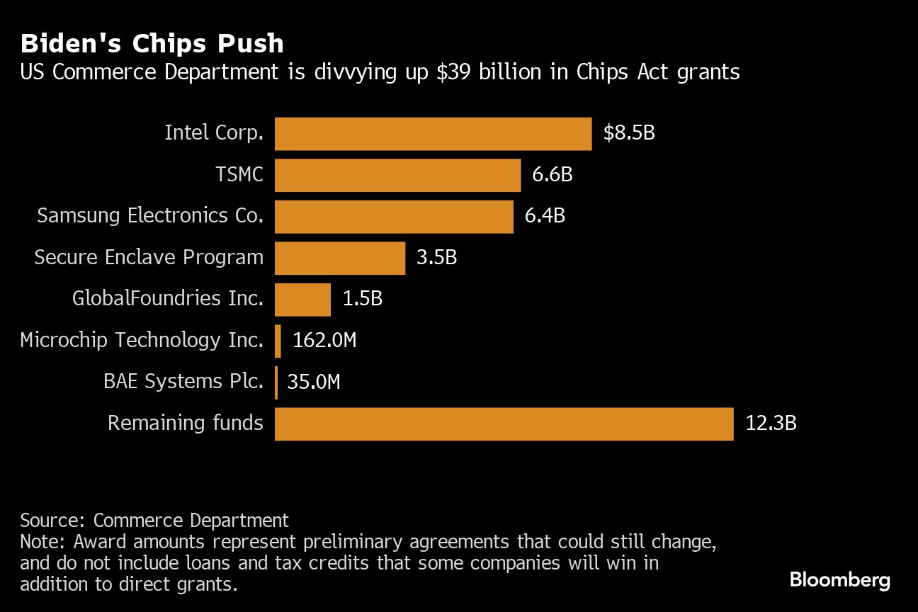 The Chips Act — which set aside $39 billion in grants plus $75 billion in loans and guarantees — has spurred more than $200 billion in private semiconductor investments. Intel snagged almost $20 billion in grants and loans. TSMC, the main chipmaker for Nvidia Corp. and Apple Inc., got $11.6 billion.