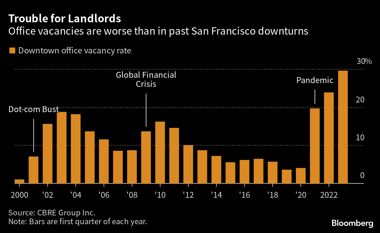 It's a “triple whammy,” said Michael Covarrubias, chief executive officer of local real estate developer TMG Partners and former head of the Bay Area Council, a group of business leaders focused on the region's economic vitality. “We've never had this much vacancy in downtown San Francisco and a pandemic, followed by the work-from-home thing, followed by the banking thing started by Silicon Valley Bank and now sort of matriculating into the big banks, commercial loans and all that.”