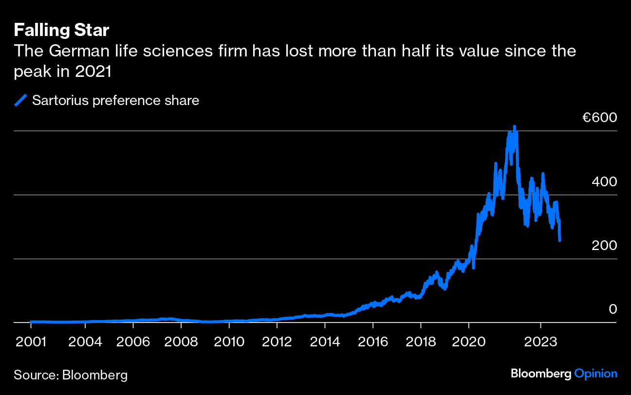 (Bloomberg Opinion) -- One of this century's top performing European stocks has fallen back to earth with a thud. The struggles of German life-sciences firm Sartorius AG encapsulate the pain caused to businesses by rising interest rates, fading Chinese demand and the normalization of sales following the pandemic. Thought by investors to be somewhat recession-proof, Sartorius has turned out to be alarmingly volatile.