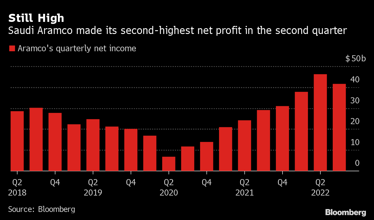 Aramco's net income was $42.4 billion in the third quarter. That was down from a record profit of $48 billion between April and June, but up around 40% year-on-year.