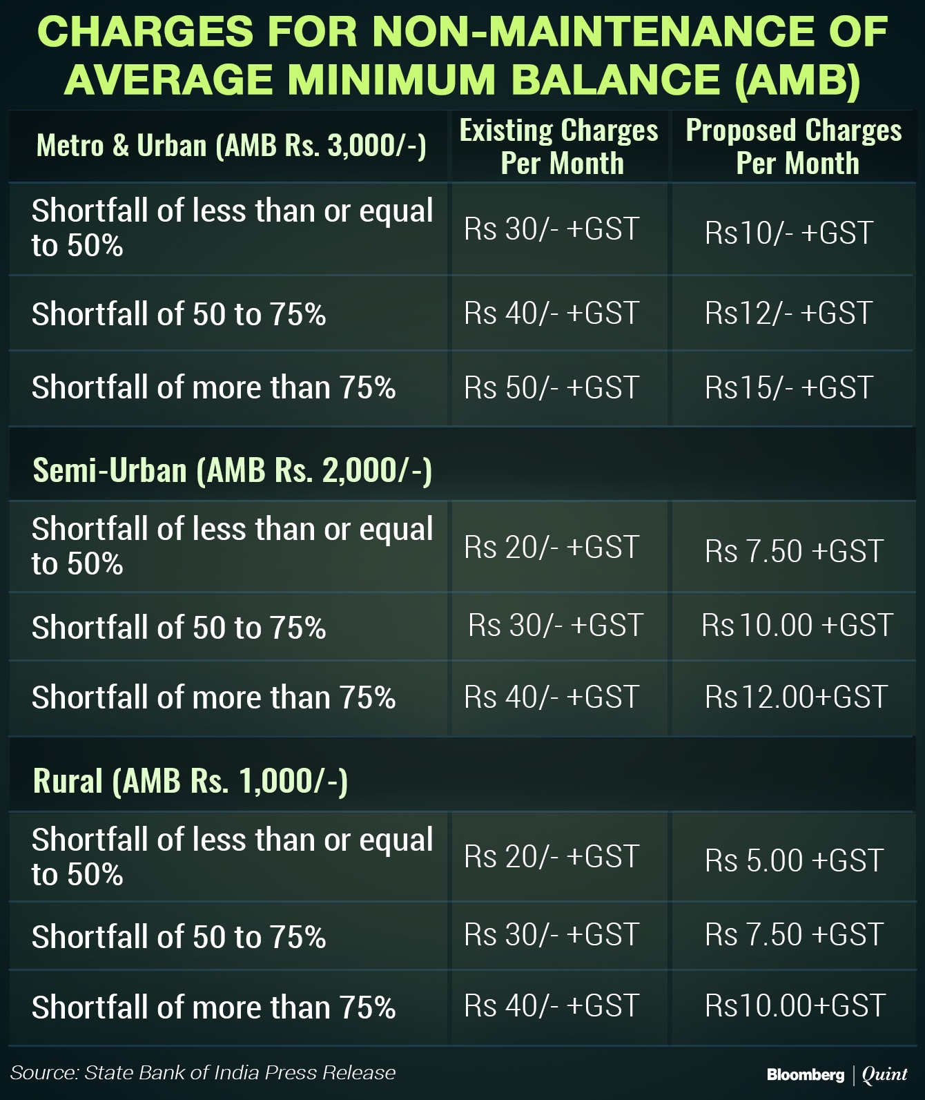 The country's largest lender will charge a maximum of Rs 15 per month from urban customers, down from Rs 50 earlier, according to its press release. For semi-urban and rural customers, the maximum penalty has been lowered to Rs 12 and Rs 10 respectively, down from up to Rs 40 a month earlier. Goods and services tax charges will be applicable, the release added.