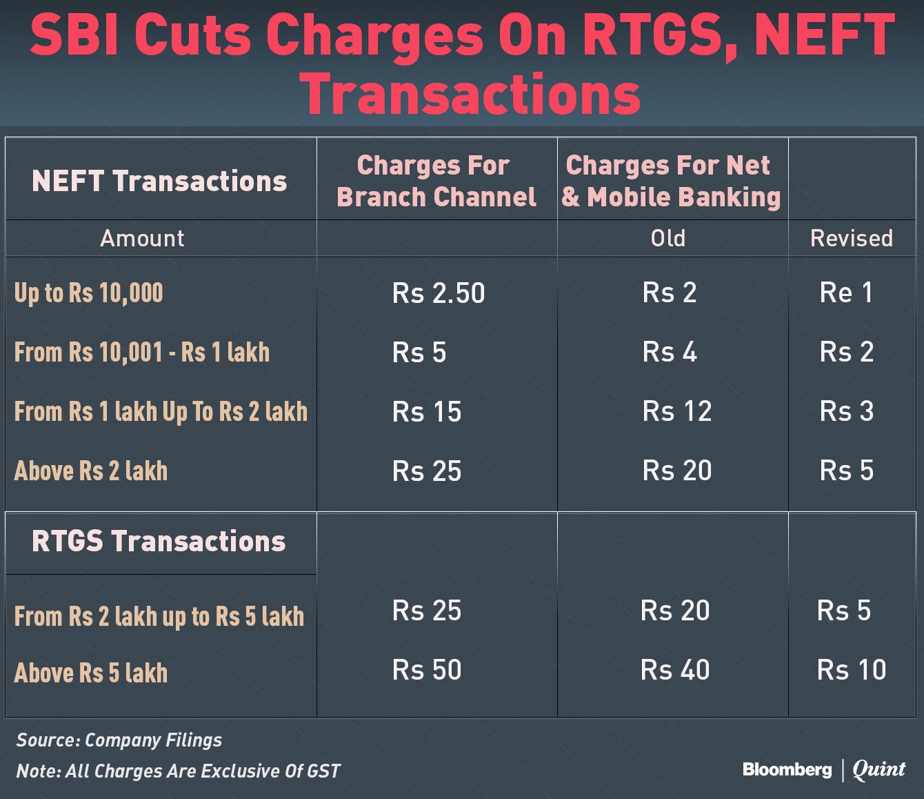 Similarly, charges on NEFT transactions from Rs 10,000 up to those above Rs 2 lakh will be charged between Re 1 and Rs 5.