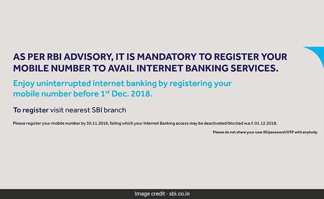 By registering his or her mobile number with SBI by November 30, 2018, the internet banking subscriber will be able to use the service in an "uninterrupted" manner, according to the bank's website.