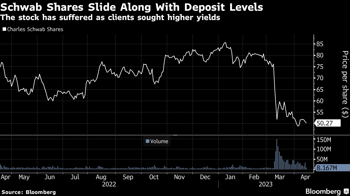 Schwab's customer deposits slid 11% since year-end to $325.7 billion as of March 31. They're down 30% from a year earlier, a drop that roughly matched Wall Street estimates.