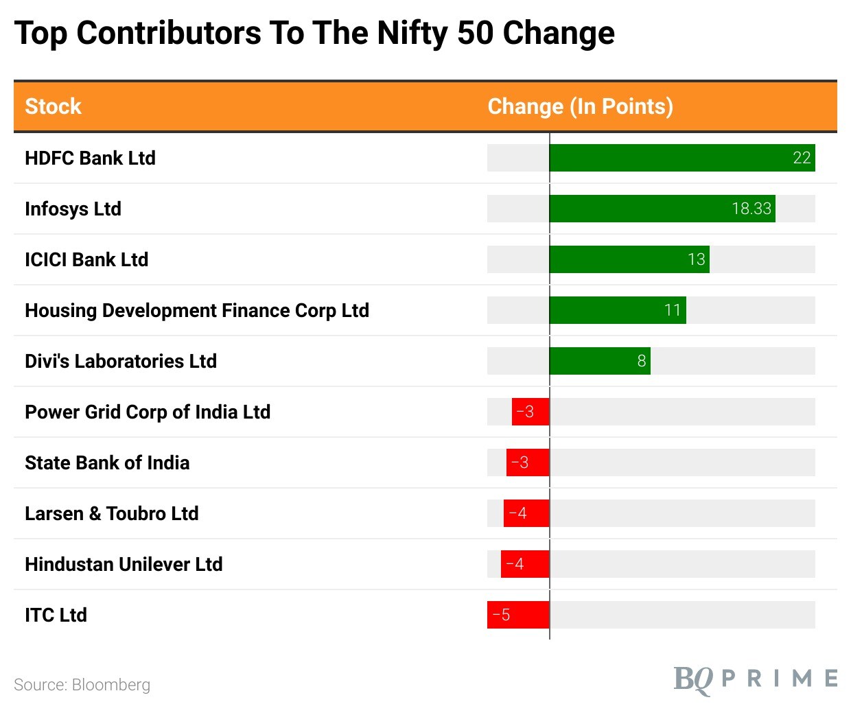 HDFC Bank Ltd., Infosys Ltd., ICICI Bank Ltd., Housing Development Finance Corp Ltd., and Divi's Laboratories Ltd. were the top gainers in the NSE Nifty 50 gauge.