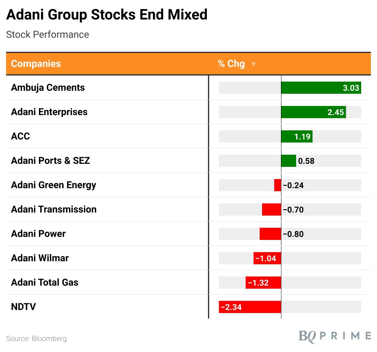 Shares of the Adani Group of Companies ended mixed in trade. While Ambuja Cements Ltd., Adani Enterprise Ltd., ACC Ltd., and Adani Ports and SEZ Ltd. rose in trade on Wednesday, the rest of the company stocks declined.