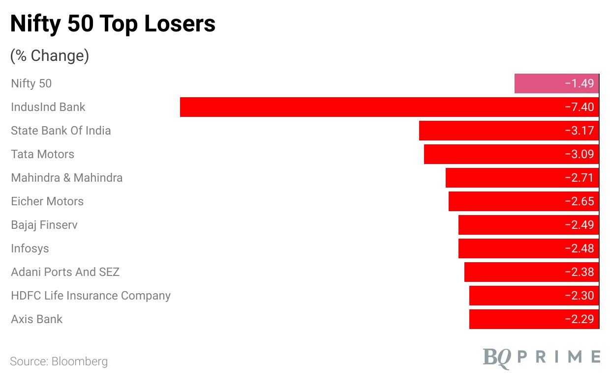 Tech Mahindra Ltd. and Apollo Hospitals Enterprise Ltd. were the only gainers of Nifty 50 index, while IndusInd Bank Ltd., State Bank of India, Tata Motors Ltd., Mahindra & Mahindra Ltd., and Eicher Motors Ltd. were the top losers.