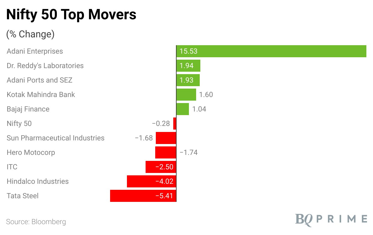 Adani Enterprises Ltd., Dr. Reddy's Laboratories Ltd., Adani Ports And SEZ Ltd., Kotak Mahindra Bank Ltd. and IndusInd Bank Ltd. were the top gainers in the gauge.