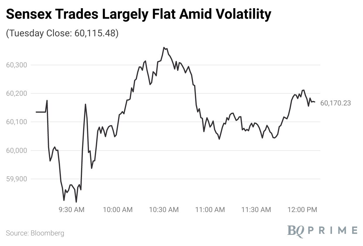 As of 12:05 pm, the S&P BSE Sensex was up 60 points, or 0.1%, at 60,175.04, while the NSE Nifty 50 was 2 points, or 0.01%, higher at 17,916.55.