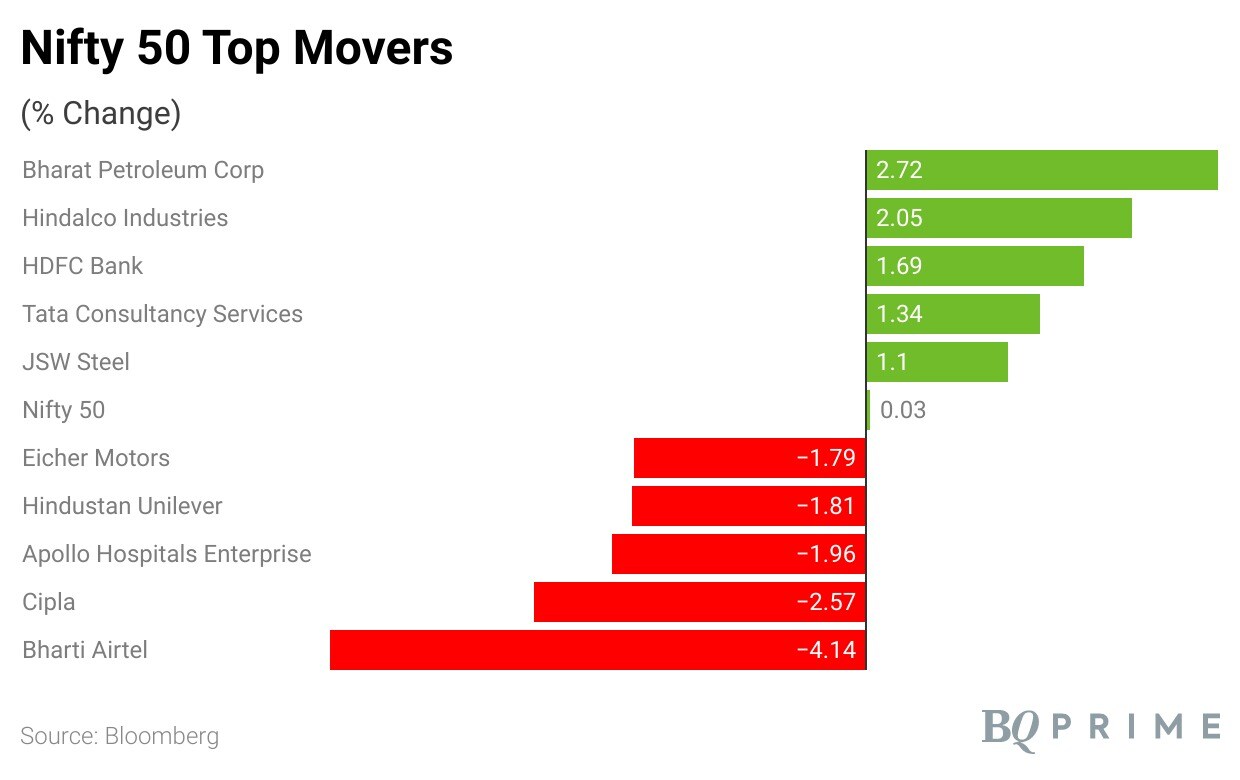 BPCL Ltd., Hindalco Industries Ltd., HDFC Bank Ltd., Tata Consultancy Service Ltd., and JSW Steel Ltd. were the top gainers among the NSE Nifty 50 constituents.